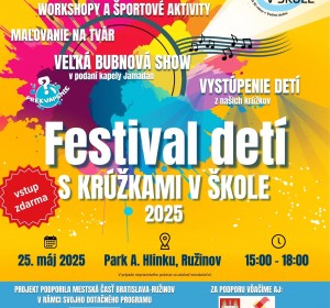 OZ Krúžky v škole vďaka podpore v rámci dotačného programu MČ Bratislava-Ružinov, pre vás pripravilo šiesty ročník podujatia Festival detí s Krúžkami v škole. Podujatie sa uskutoční 25.5.2025 v Parku Andreja Hlinku v Ružinove. Prebiehať bude v čase od 15:00 do 18:00 hod 🙂